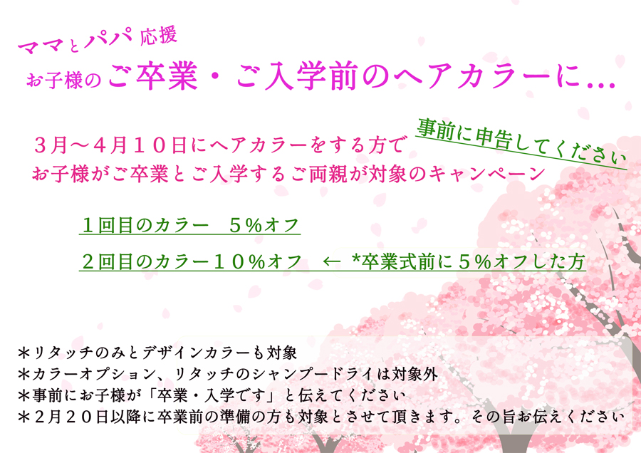 ご卒業おめでとうございます お子様の成長と共に節目節目やってくる卒入学式シーズン。ご準備が大変な時期でもありますが、ご両親の身だしなみのご準備として、今回初めて企画してみました! その名も「ママ&パパ割」 ご卒業と書いて […]