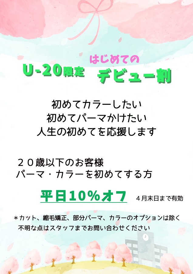20歳以下のお客様で、人生初のヘアカラー、パーマの価格から10%オフ(平日のみ)とさせて頂きます。